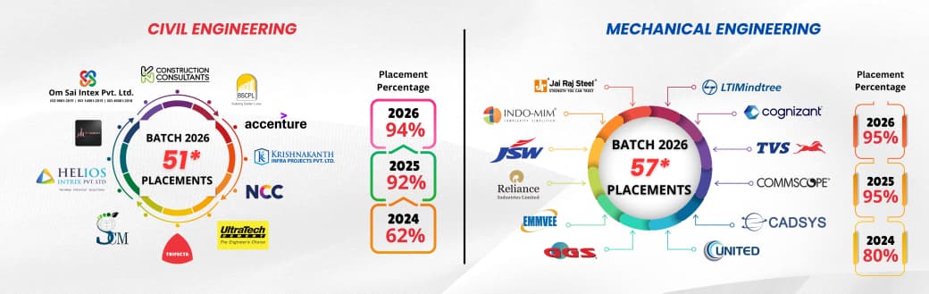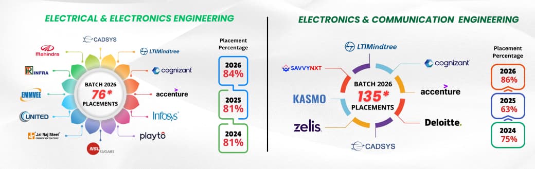 In UG program we offer Computer Science and Engineering, Electrical & Electronics Engineering, Electronics & Communication Engineering, Civil Engineering, Mechanical Engineering, Computer Science and Business Systems and Computer Science and Technology. In PG we offer Structural Engineering, CSE, VLSI.