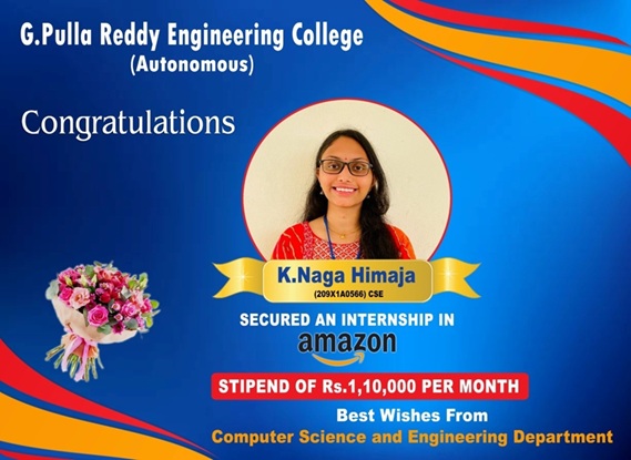 - K.Sai Sudha of IV CSE got internship in Amazon Company in this academic year (2022-23) with a stipend of Rs 1,10,000 per month..