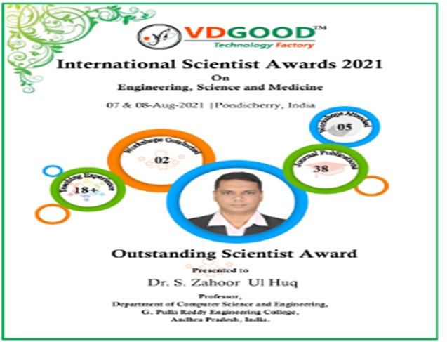 - Dr.S.Zahoor Ul Huq, Professor of CSE Department, G Pulla Reddy Engineering College was awarded with “Outstanding Scientist award” by VDGOOD Technology Factory International Scientist Awards 2021 on Engineering, Science and Medicine which was conducted on 7th and 8th August 2021 in Pondicherry, India.